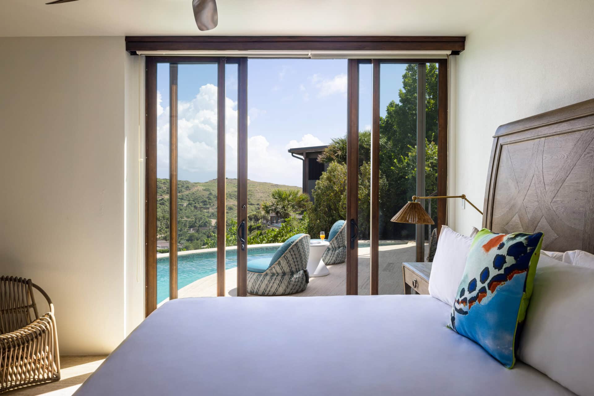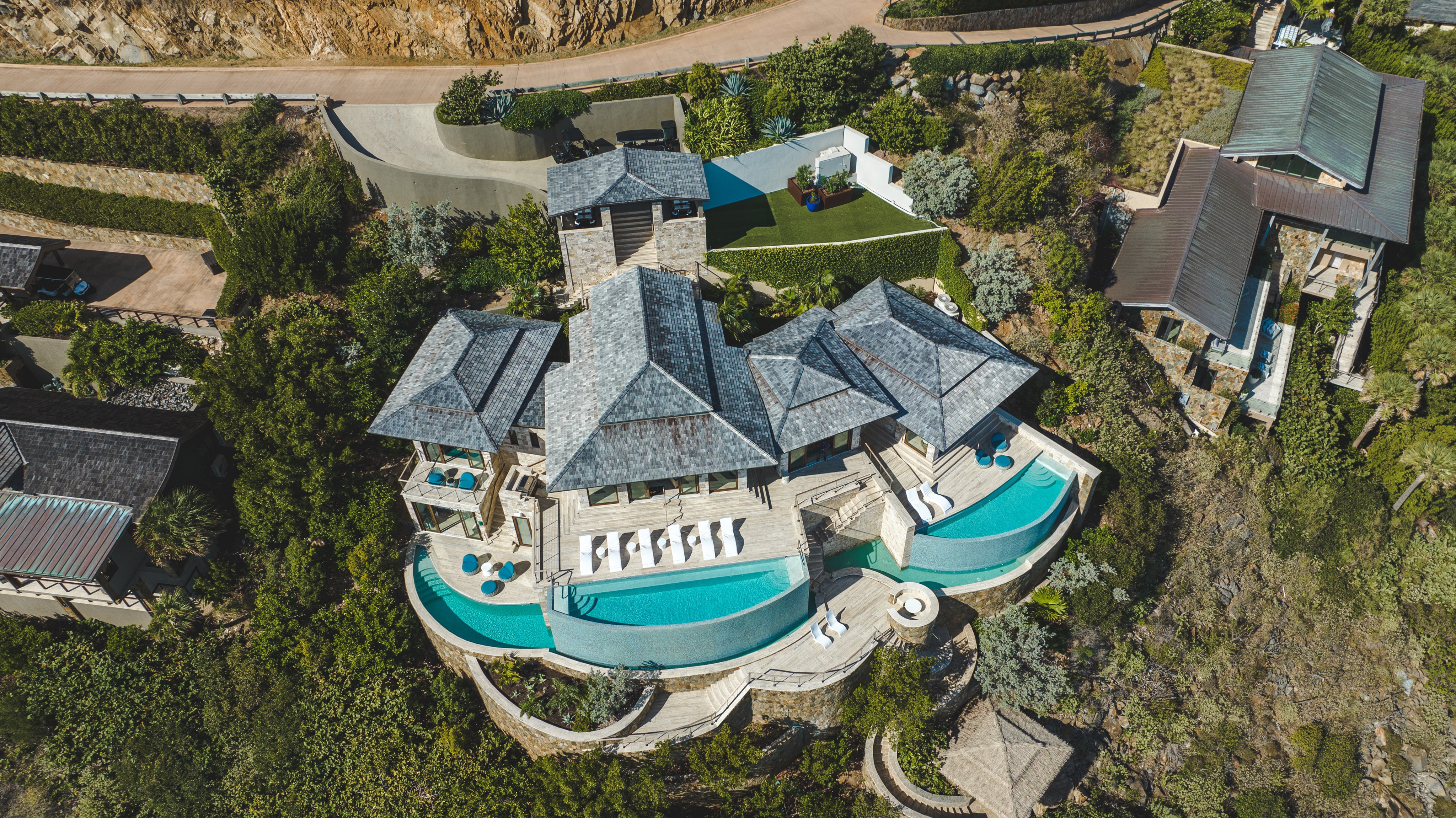 Perched in the quiet hills of the Ridge neighborhood, the Edge of Paradise affords sweeping North- and East-facing views of the Bay and surrounding islands, with an open-plan living space that makes the most of the island’s cooling Easterly trade winds. The House was designed by Joseph Mosely Architects of Michigan, and was specifically designed for the topography and geometry of the lot. As a result, it offers the utmost privacy and is not visible from the road. Two primary suites occupy the villa’s upper level, while two additional bedrooms round out the lower level, offering maximum privacy.