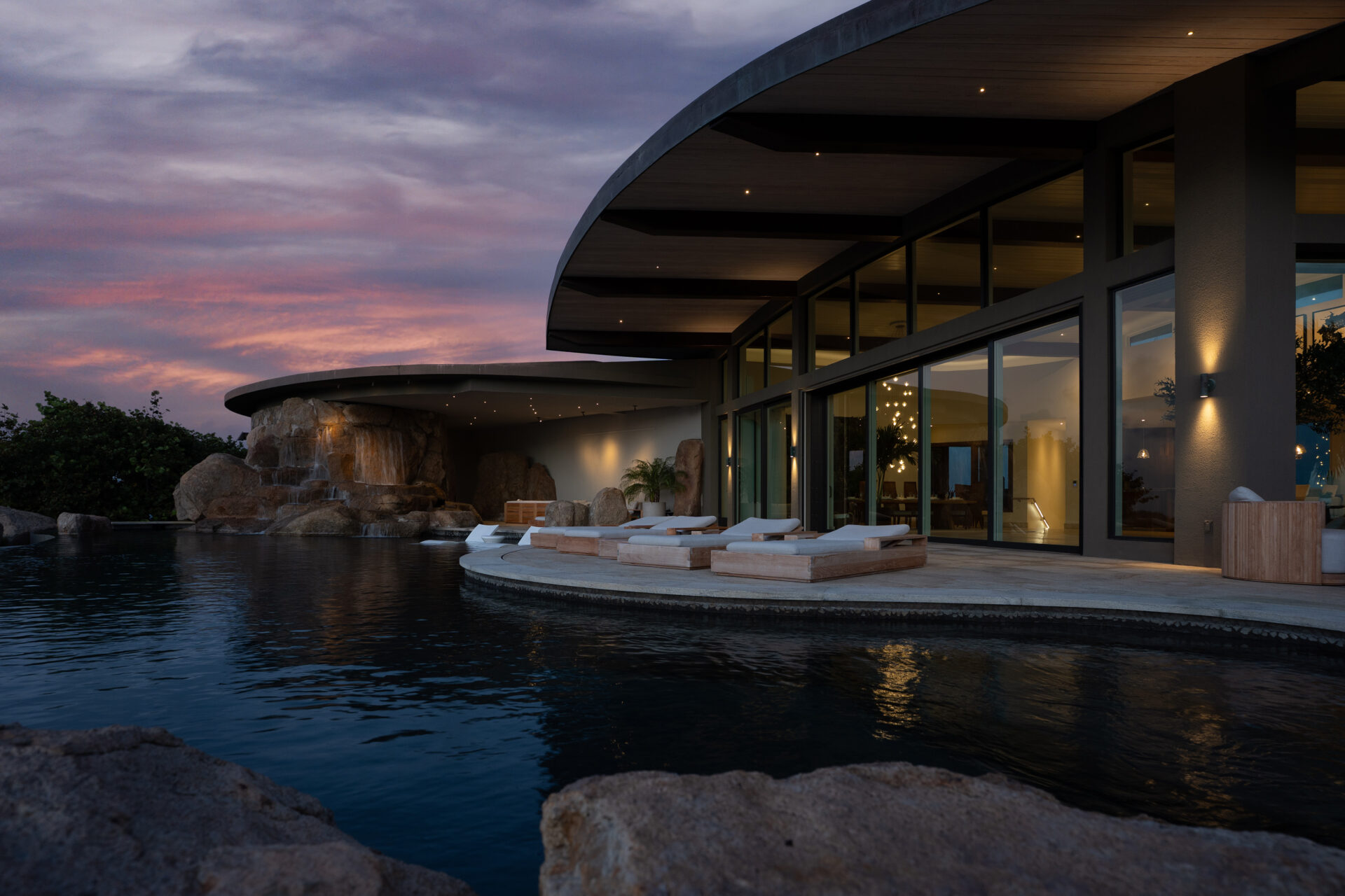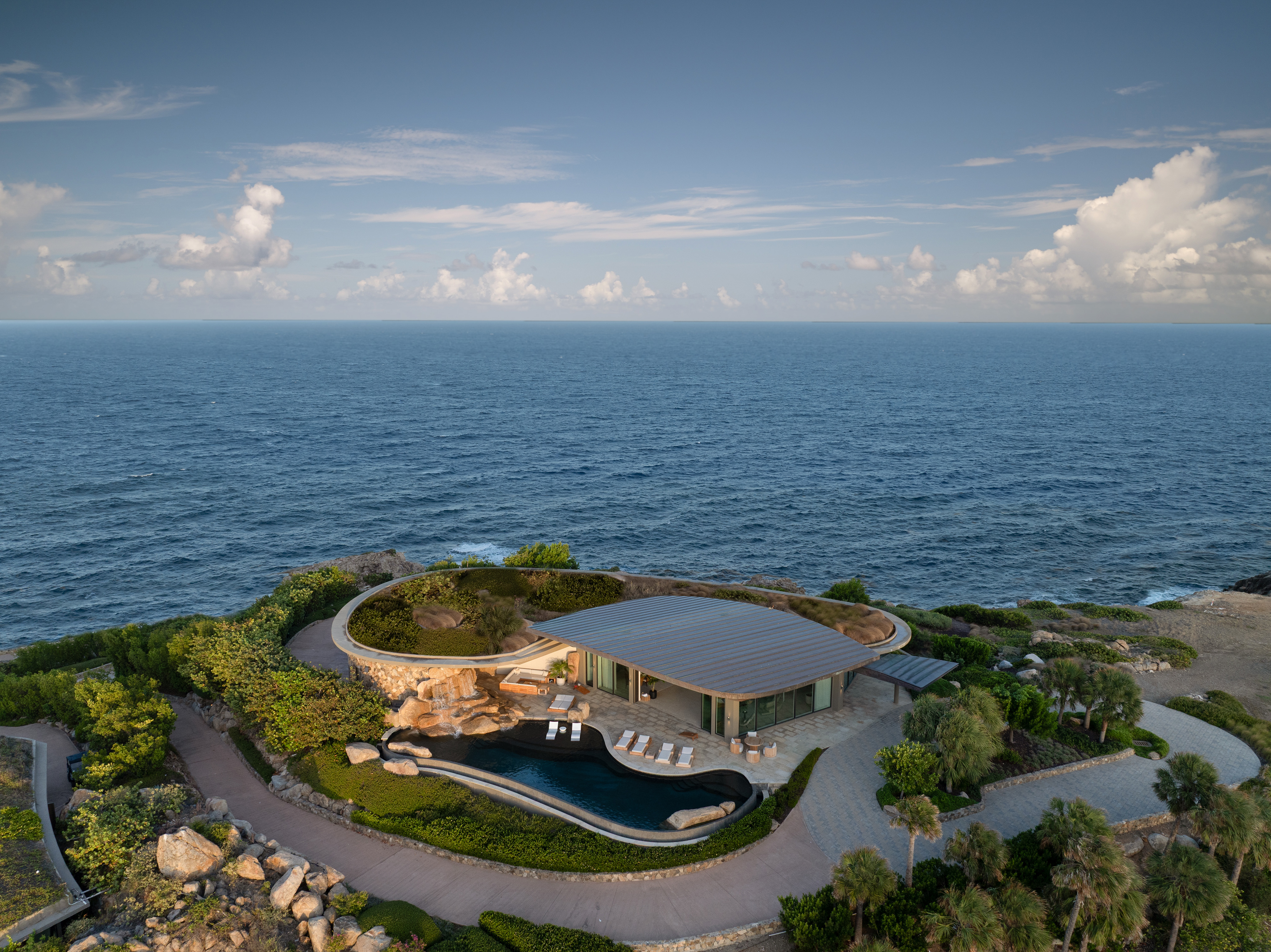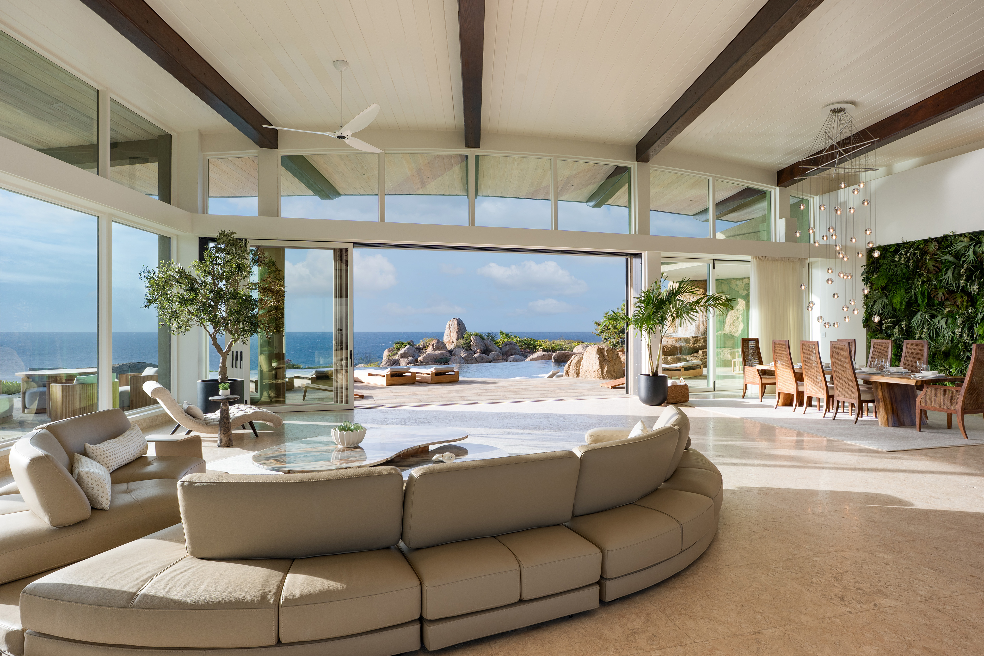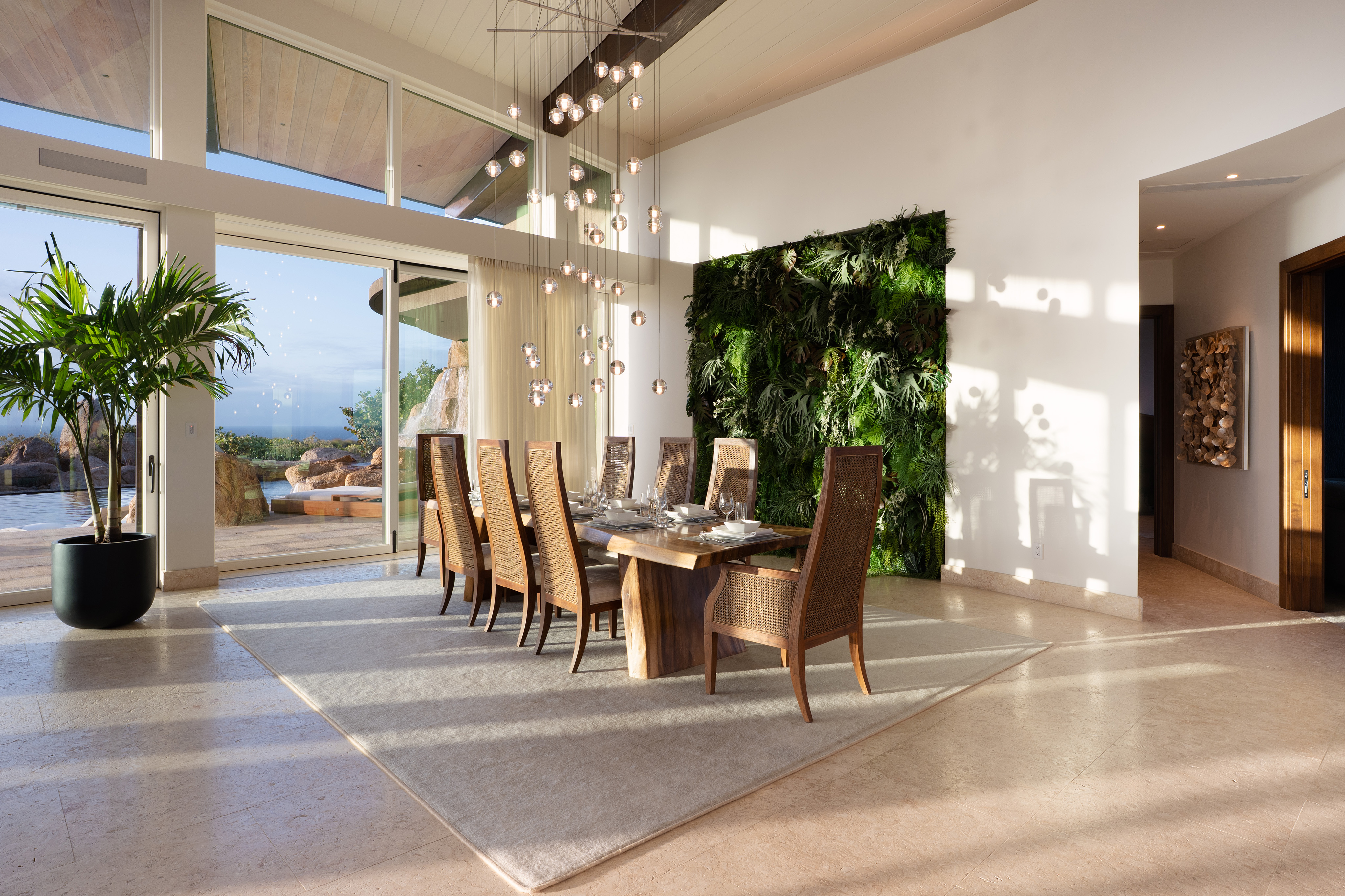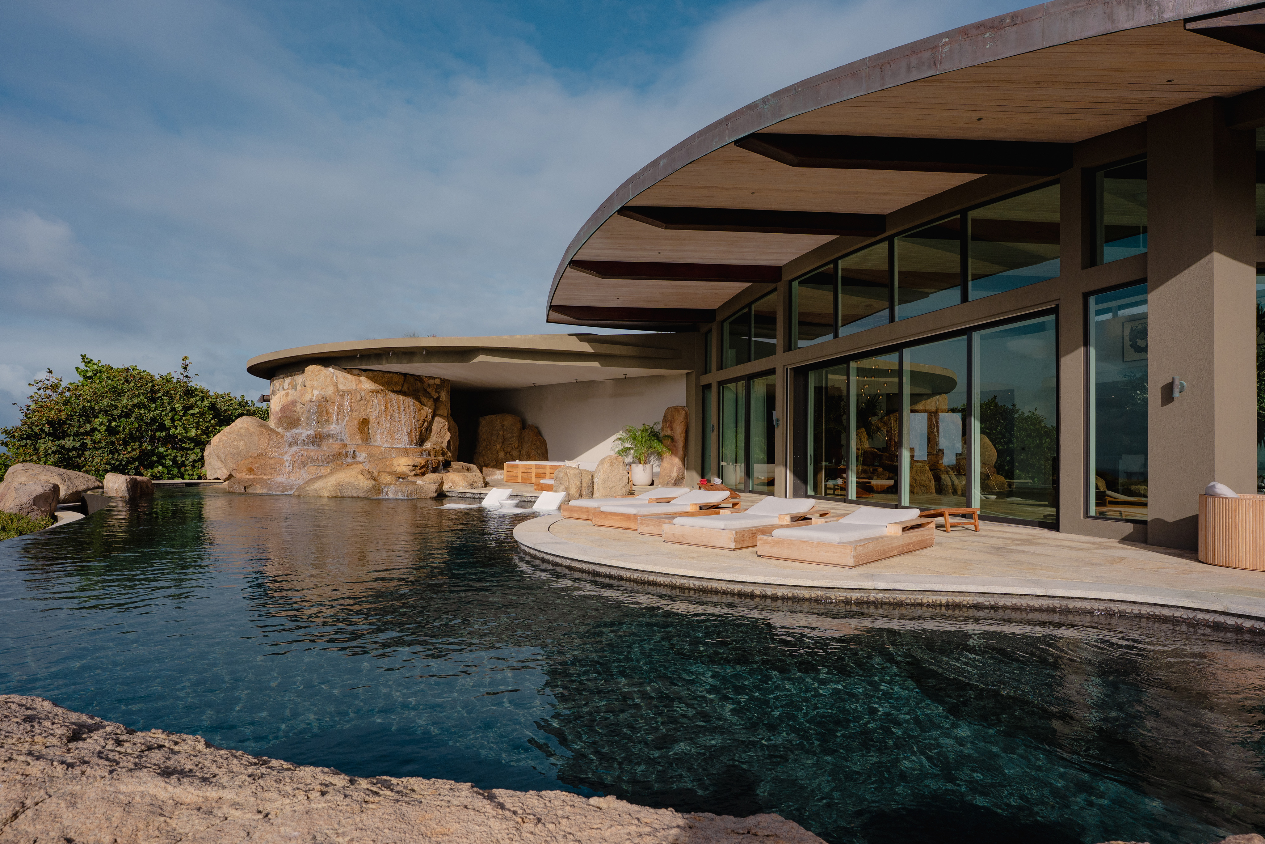 Halo’s organic design was built in harmony with the land following Oil Nut Bay’s vision to make the land as much of a feature as the home. Halo is set on a lush expanse of green topography and rising rocky terrain—both brimming with native flora and fauna—which unfolds in undulating patterns against the backdrop of a turquoise Caribbean Sea. The seamless integration of native stone, steel, glass, green roof, and infinity pool with a custom native stone boulder waterfall showcases cutting-edge design, quality craftsmanship and exceptional attention to detail.