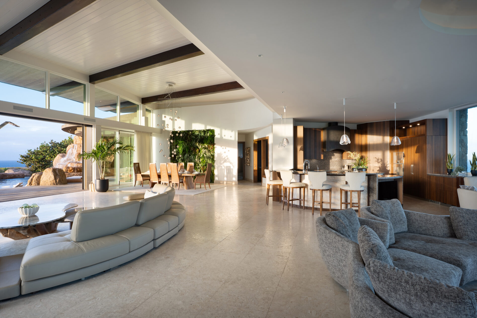 Halo’s organic design was built in harmony with the land following Oil Nut Bay’s vision to make the land as much of a feature as the home. Halo is set on a lush expanse of green topography and rising rocky terrain—both brimming with native flora and fauna—which unfolds in undulating patterns against the backdrop of a turquoise Caribbean Sea. The seamless integration of native stone, steel, glass, green roof, and infinity pool with a custom native stone boulder waterfall showcases cutting-edge design, quality craftsmanship and exceptional attention to detail.