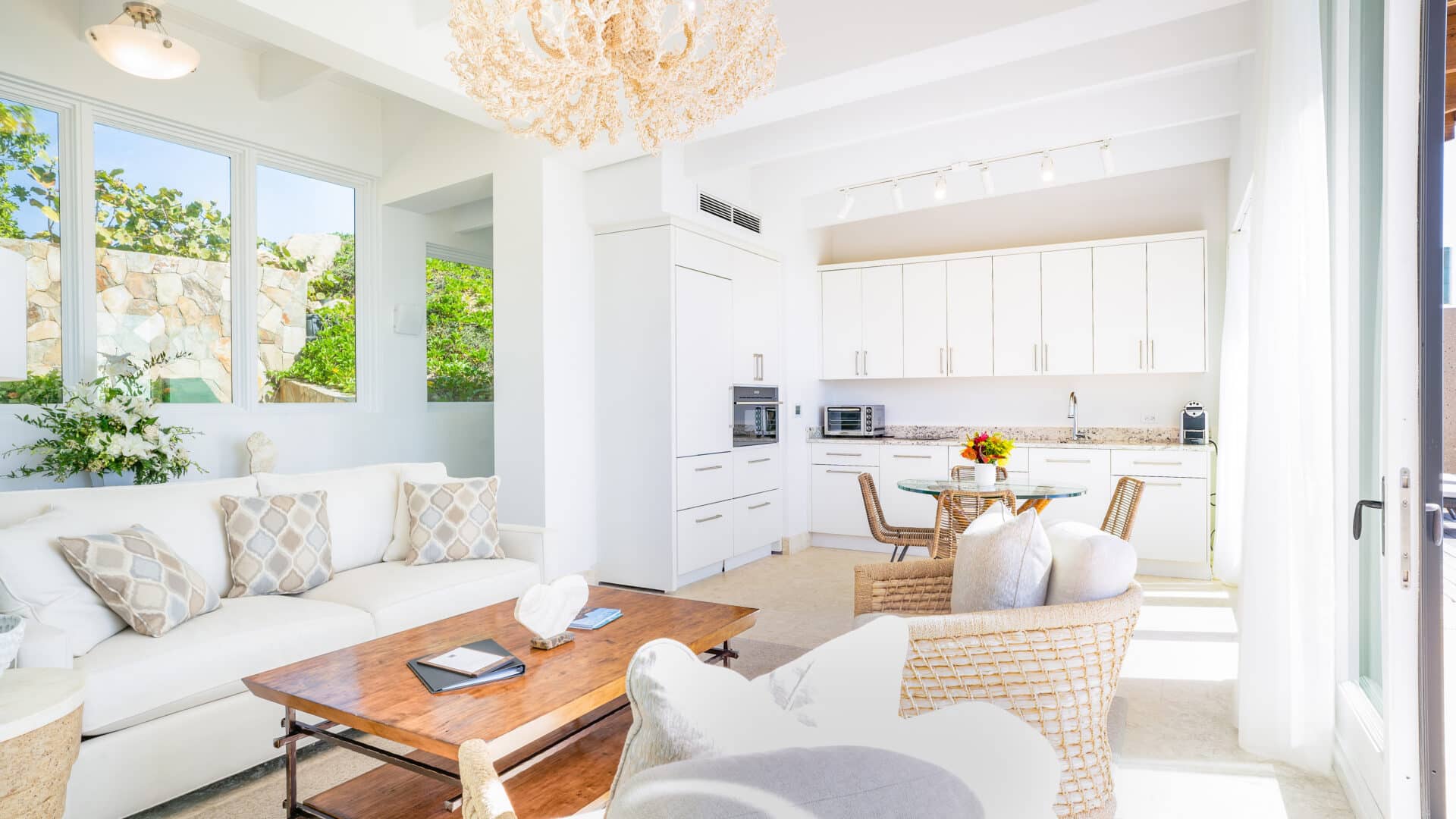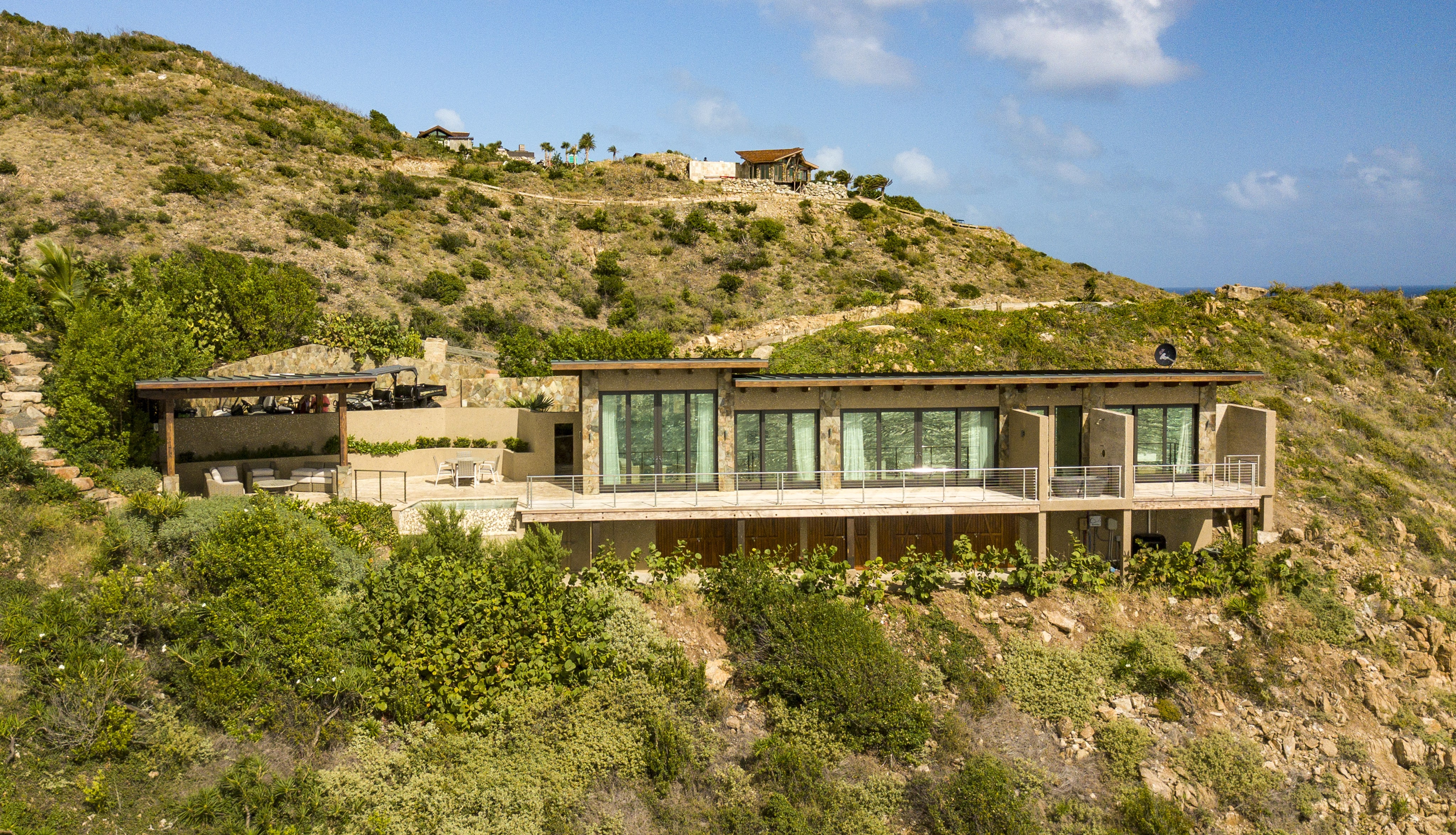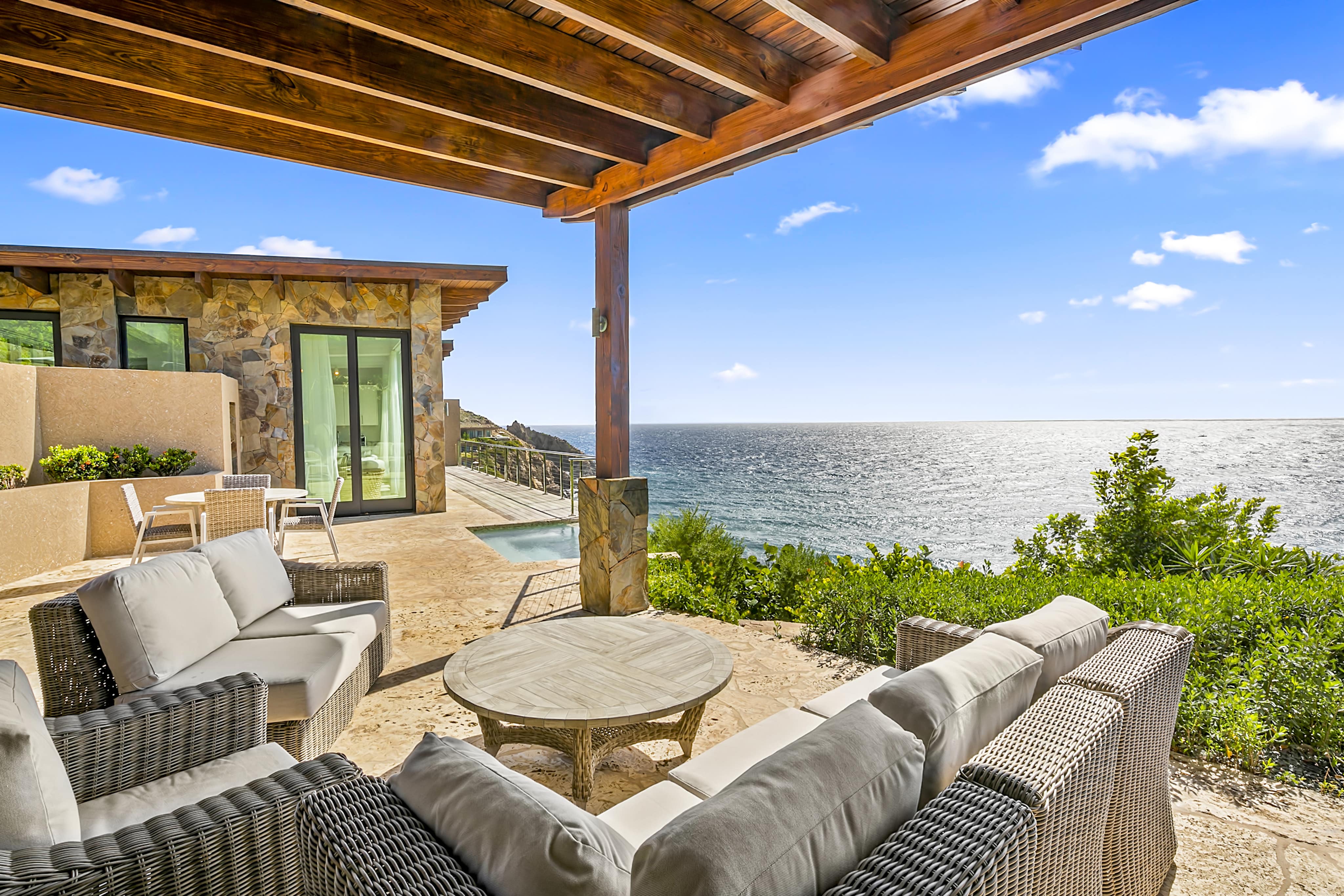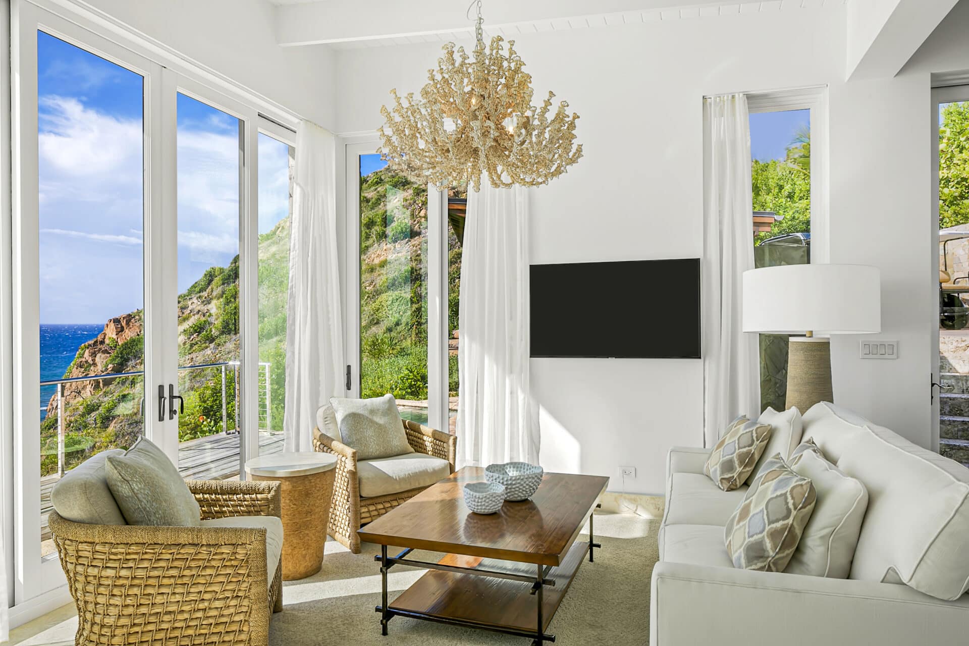 Overhanging the ocean on the southern ridge of Oil Nut Bay, Sol Mate Villa opens up to a full 180-degree view of the Caribbean Sea. As one of our most exclusive two-bedroom British Virgin Islands rentals, it is the epitome of simple island elegance. Clad in beautiful native stone, the vacation villa’s natural color palette allows it to blend seamlessly into the landscape. Soft tropical light streams through floor-to-ceiling glass doors that run the length of the home, and the cool ocean breeze carries with it the soothing sounds of the breaking waves beneath.